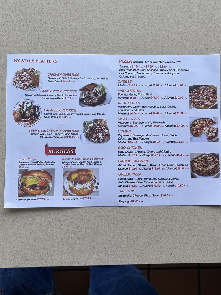 Served over rice with salad, creamy garlic sauce, hot sauce, and naan bread.